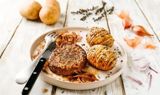 Steak haché, sauce à l’échalote et pommes de terre Hasselback