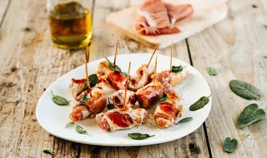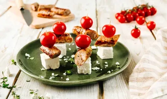 Brochettes de chipolatas aux herbes, feta et tomates cerise