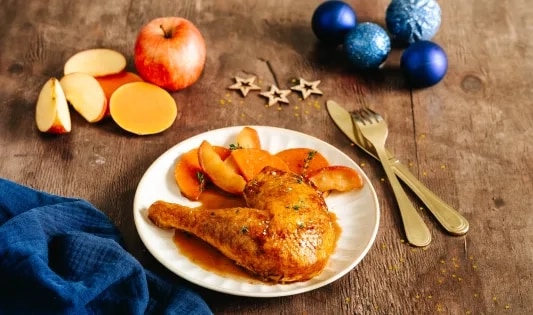 Poularde rôtie au cidre, pommes caramélisées et courge butternut glacée au cidre