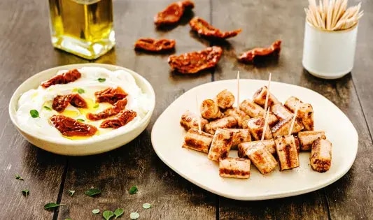 Saucisses de volaille et dip à la ricotta et tomates confites