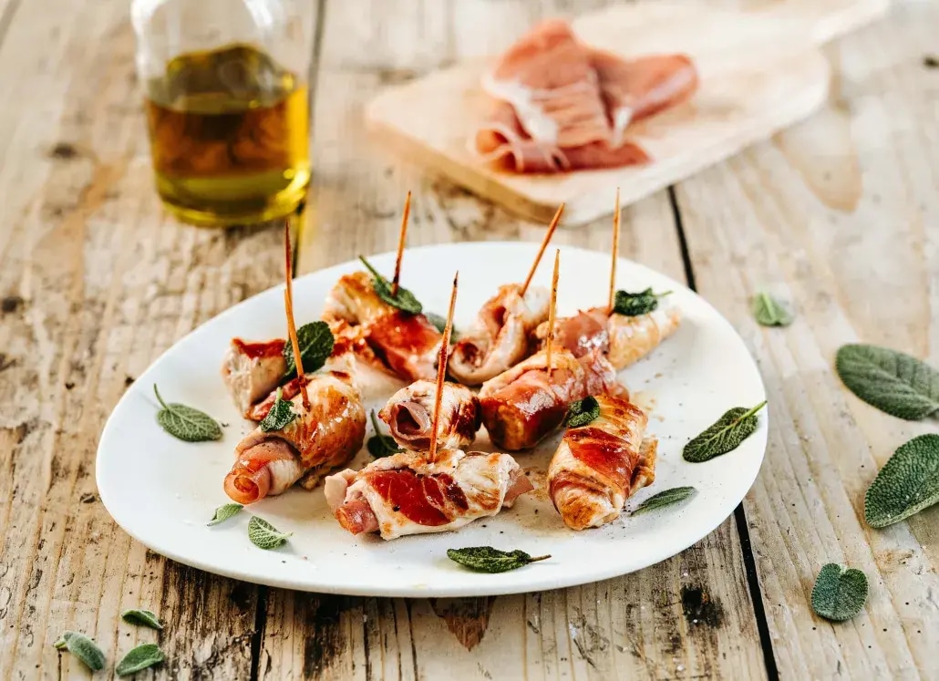 Bouchées de dinde et prosciutto façon saltimbocca : un classique italien revisité.