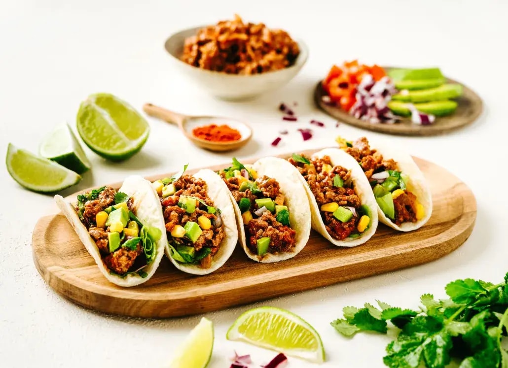 - Dresser les tacos avec la préparation précédente, puis ajouter quelques feuilles de salade, des morceaux d’avocat, de tomates, du maïs et de la coriandre.