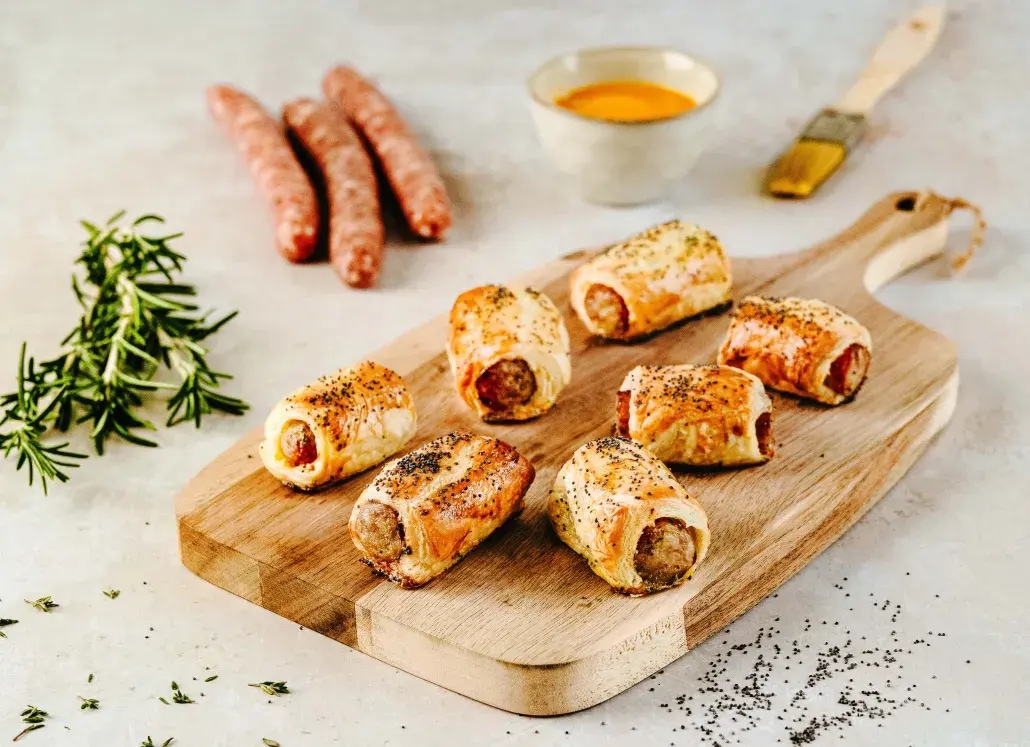 - Couper des bandes de pâte feuilletée et enrouler les saucisses dedans, un seul tour suffit.