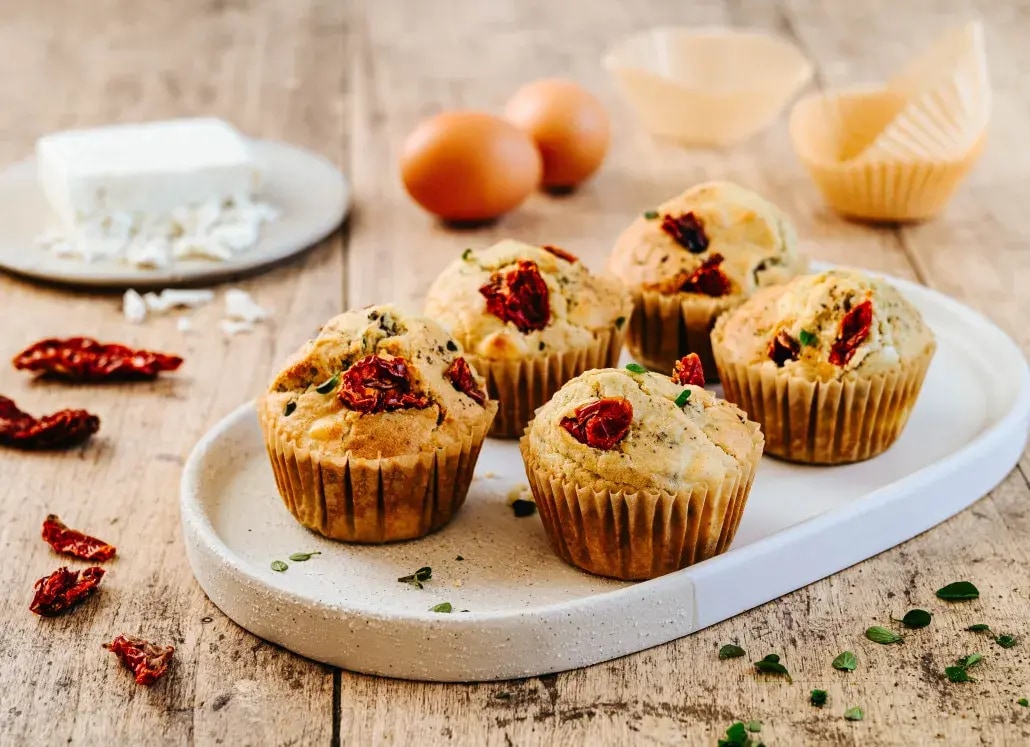 - Dans un autre saladier, battre les œufs, ajouter le lait, le beurre fondu, les tomates séchées coupées en petits morceaux et la feta coupée en petits cubes.