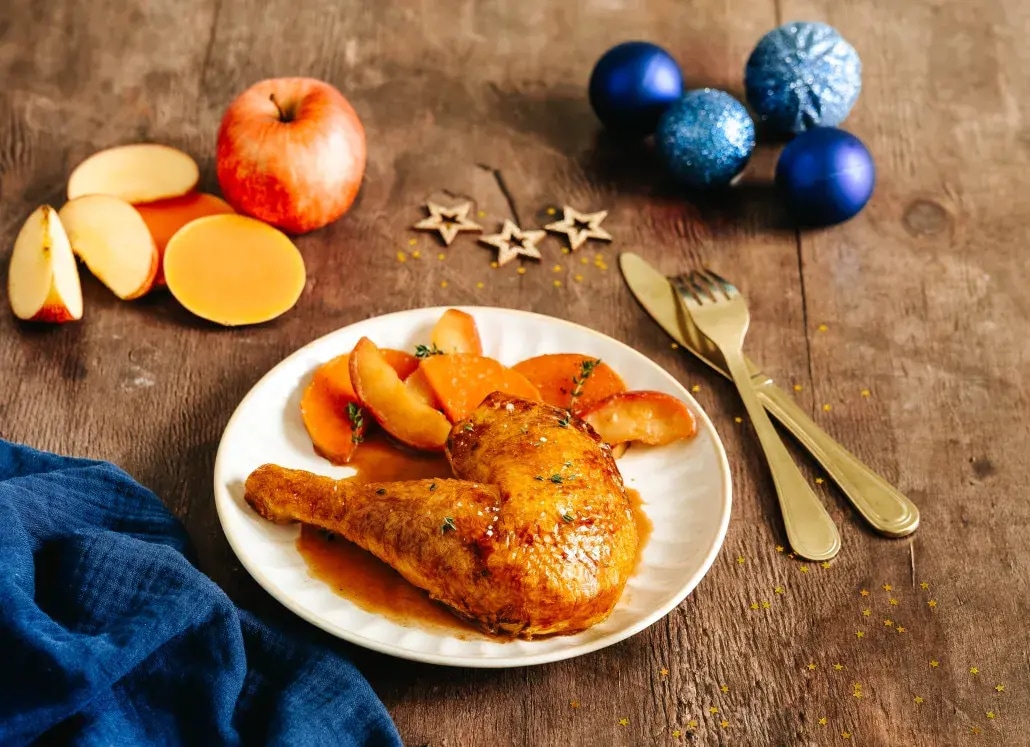 Une poularde dorée au cidre, pommes fondantes et butternut tout en douceur.