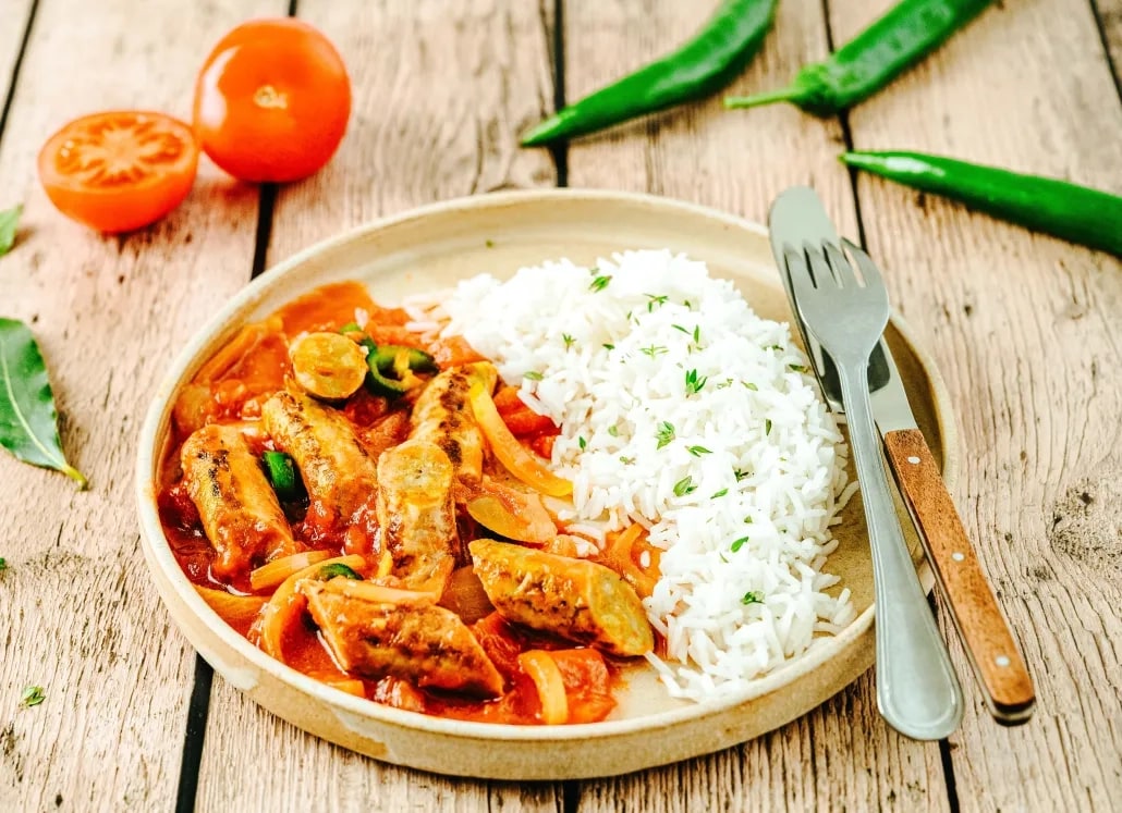 - Éplucher et émincer finement l’oignon. Éplucher l’ail et le gingembre. Couper les tomates en dés. Couper les saucisses en biseaux d’environ 4 cm.