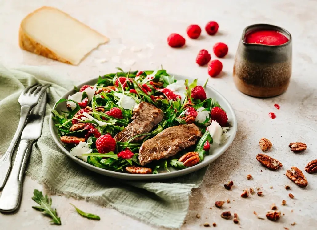 L’alliance parfaite du canard, de la roquette, la noix de pécan et les framboises pour une salade unique.