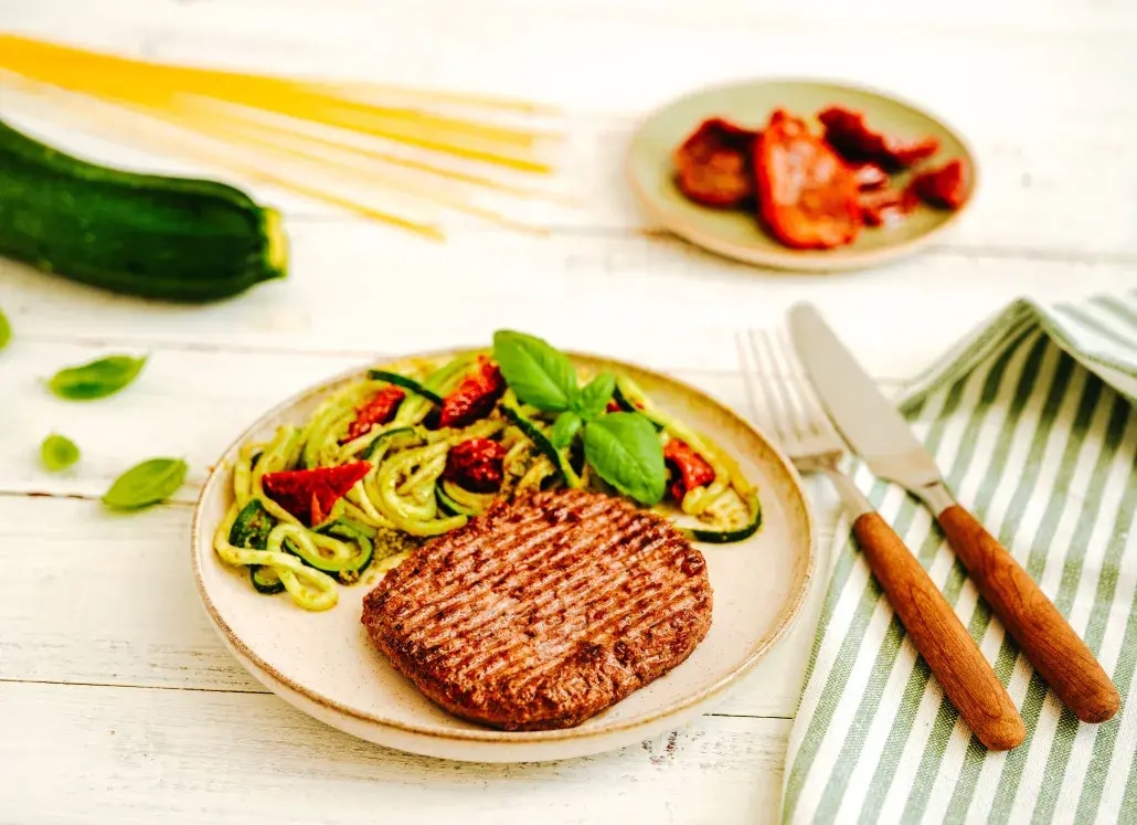 - Pendant la cuisson des steaks hachés, réchauffer les spaghettis avec le pesto et les tomates confites.