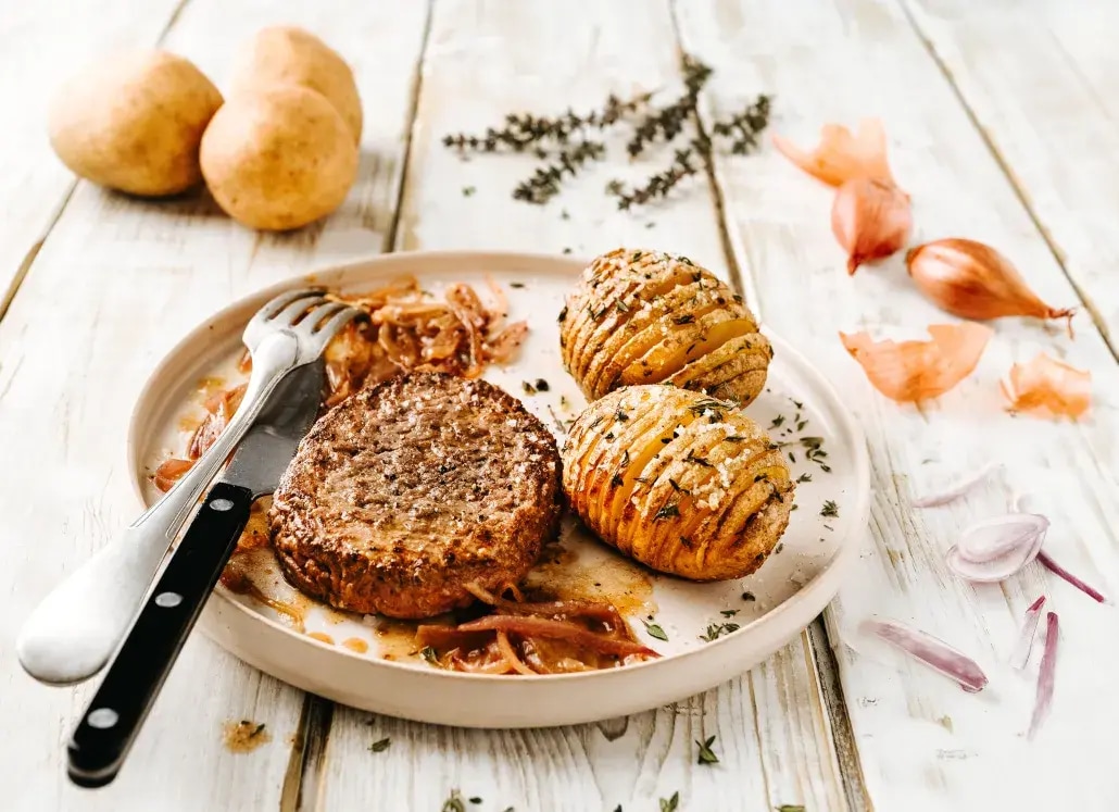 Un steak haché savoureux, accompagné d’une sauce à l’échalote douce et de pommes de terre Hasselback dorées à la perfection.