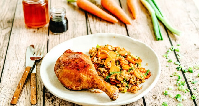 - Verser dans la poêle le vinaigre balsamique, le miel et le thym. Arroser généreusement le filet et laisser cuire 2 min.