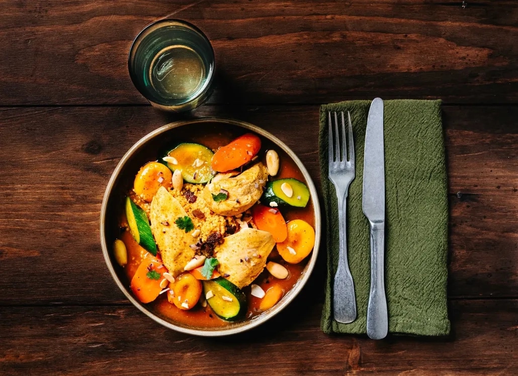 Un tajine de poulet aux abricots, parfumé et ensoleillé, servi avec une semoule aux raisins pour un voyage gourmand.