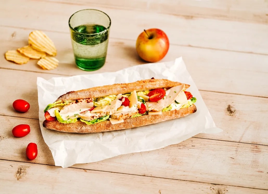 Un sandwich César au poulet, frais et généreux, pour une mise en œuvre simplifiée.